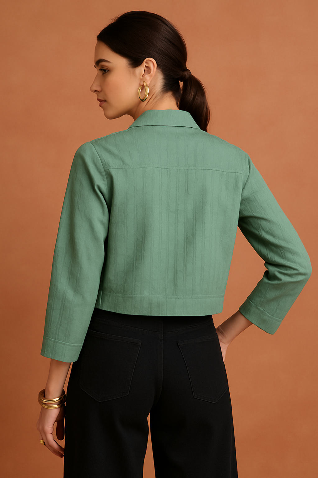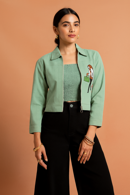This green cropped top features a unique and playful embroidered design on the left side, depicting a stylish woman carrying a handbag. The top has a classic collar, front zipper closure, and long sleeves, giving it a structured yet relaxed silhouette. The gathered, smocked panel at the bust enhances comfort and fit, making it ideal for both casual and semi-formal occasions. Pair it with high-waisted pants or skirts for a trendy, modern look.